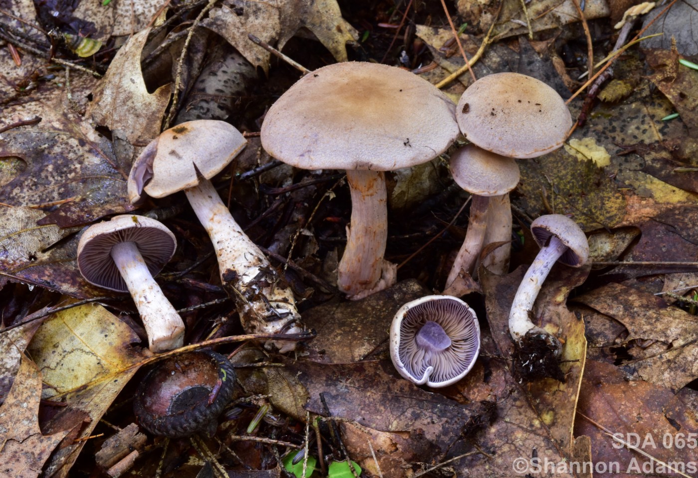 Pileus: 17-50mm across. Furry or finely scaly, flesh creamy yellow-lilac blend in middle of cap and more taupe in cap margins. Younger specimens are more generally purple – still in very muted tones and having strongly matte appearance. Flesh: Creamy center on mature specimens with grey-lilac flesh margins (outer layer). In younger sometimes the lilac flesh is in patches or isolated to the cap or uper stipe. Over time, a dark line of purple develops between lamellae and cap flesh. Lamellae: Dull purple to grey-violet. Cortina: None observed. Stipe: 32-78mm long, 5-10mm at stipe apex. Silvery white with brown traces of cortina colored with spores. Equal with clavate stipe, or slightly swollen base.