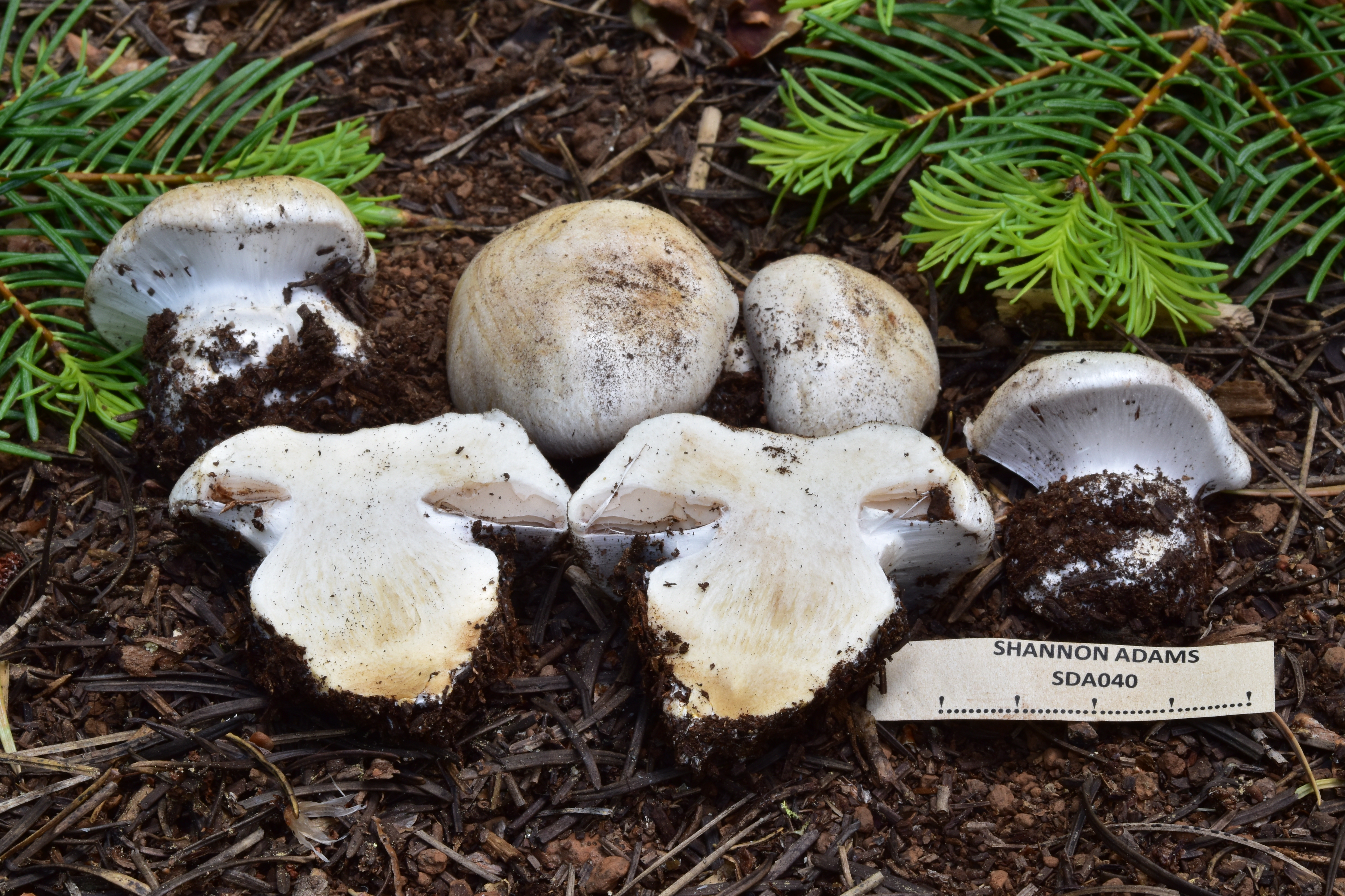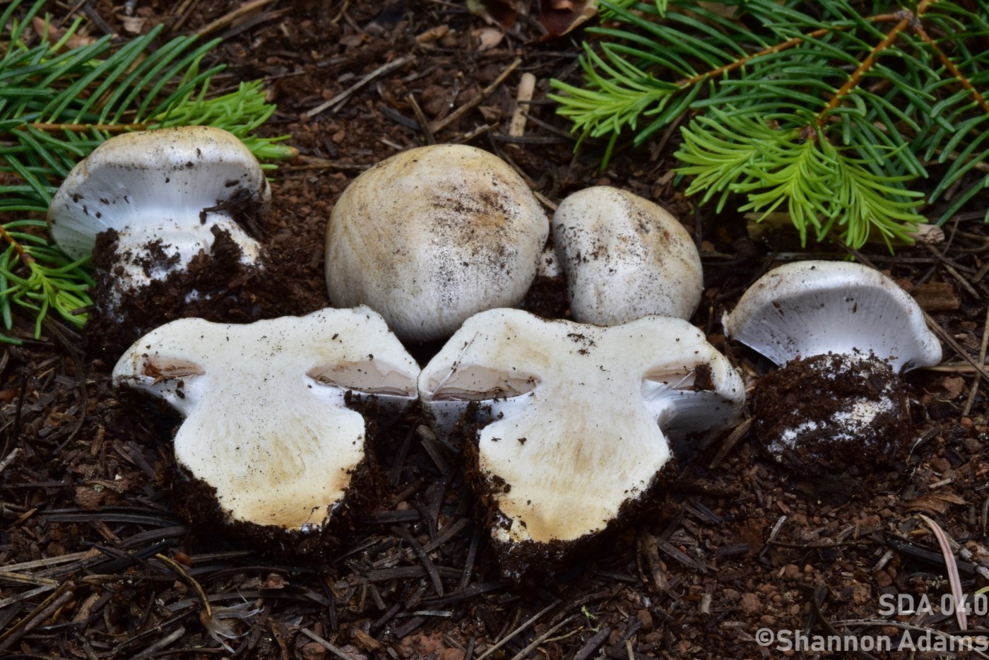 Flesh: Off-white with faint tan stain. Taste: Mild to slightly sweet. Lamellae: Pallid when young, developing rusty tones in maturity. Veil: Thick, membranous, white veil persisting through maturity. Stipe: Creamy white, mostly dirt encrusted. 19-38mm at stipe apex. 17-21mm at widest point. KOH: Slightly yellow on flesh.