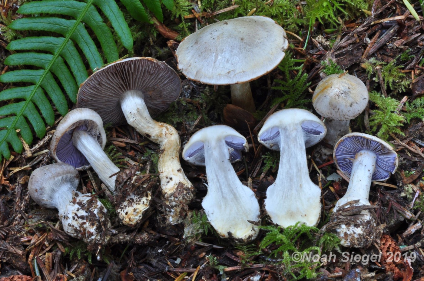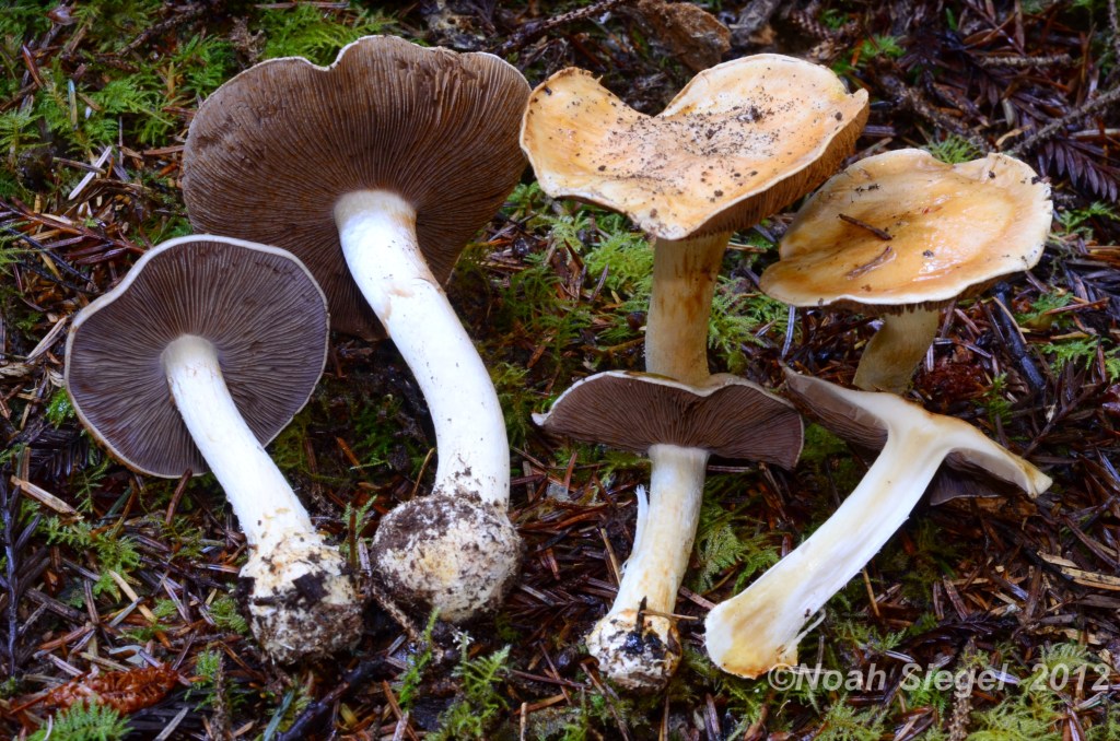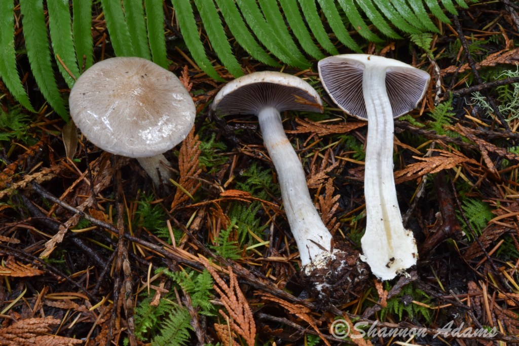 Cortinarius albescens is notable for it’s violaceous-grey gills, subdued cap tones (in shades from grey through buff to yellow ochre), long, firm, equal white stipe and small bulbous, marginate base. Smith suspected it was a Glaucopoid, and differentiated it by it’s bitter taste and “long white stipe at maturity”.