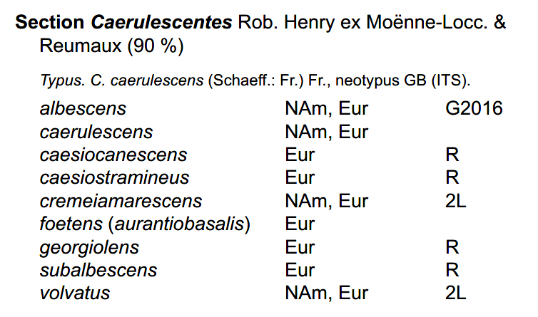More recent phylogentic studies have placed C. albescens in Section Caerulescentes. A close NAm species appears to be Cortinarius volvatus.