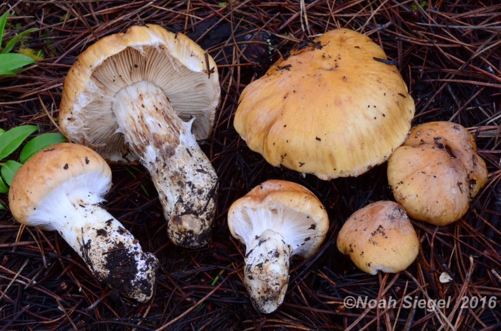 Cortinarius turmalis is a medium to large and often abundant species which you can learn to identify with confidence by observing the wrinkled (rugulose to corrugated) mature cap, and the staining of the basal mycelium. The stipe base with be white to creamy at first but turns a lilac-pink color seconds to minutes after exposure to the air. I have observed this species in Girdwood, Alaska, near the northern extent of the Pacific Northwest temperate rainforest ecosystem and in Washington State and Noah Siegel has collected it in Mendocino, CA, to the South. It has a widespread distribution in boreal conifer forest.