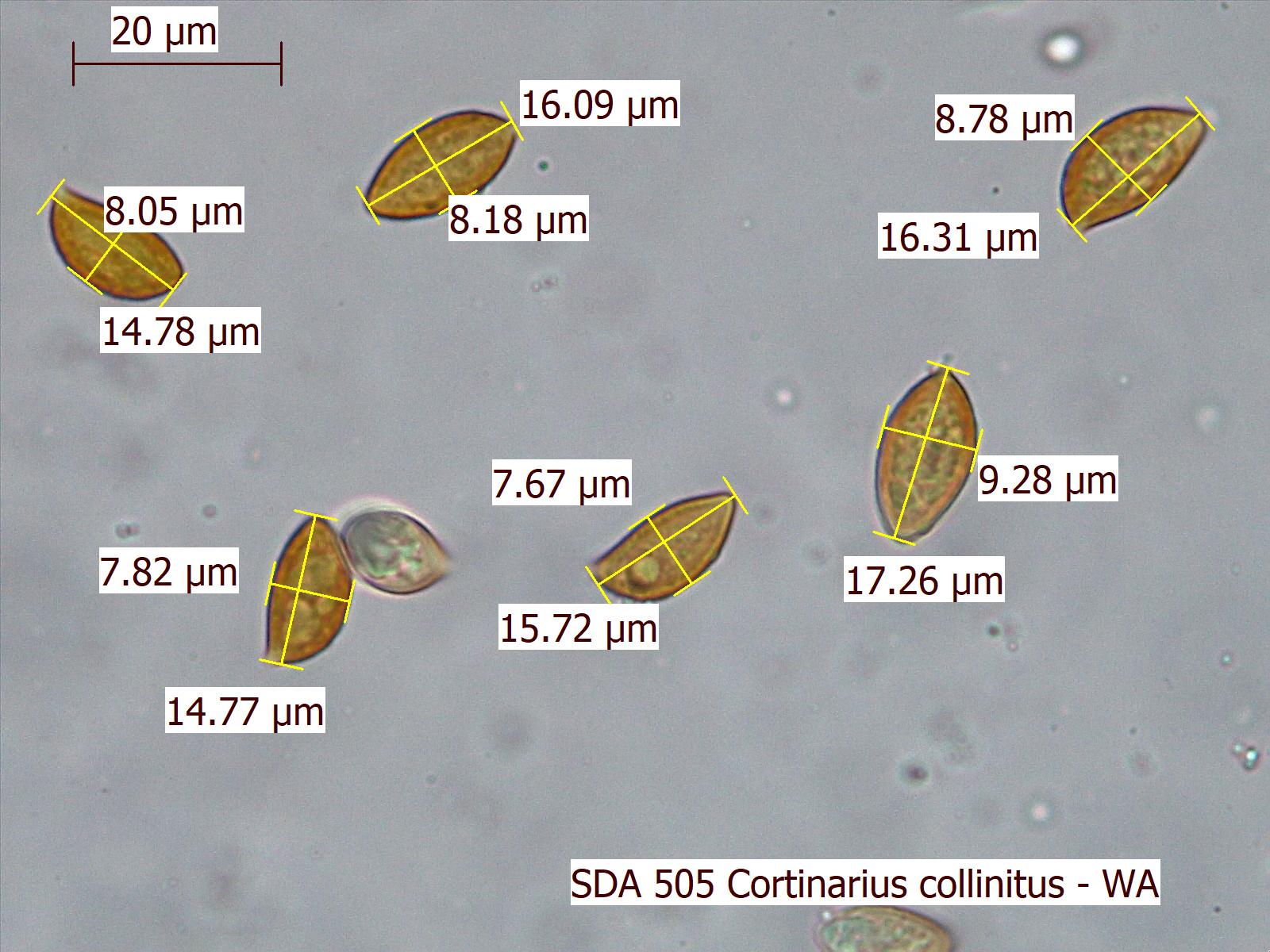 • Cortinarius collinitis – glutin on stipe lilac when fresh, seldom supposedly rarely white but often in NAm collections, browning from stipe base, largest spores of these species. Coniferous forest (in EU grows with spruce). Spores large.