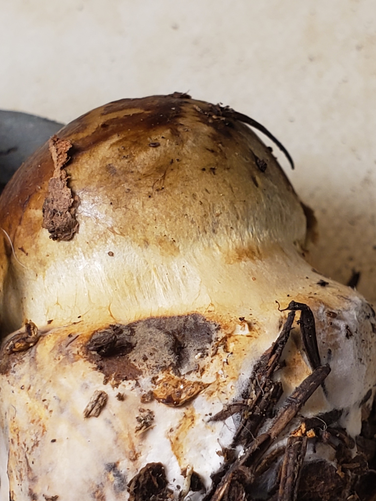 Pileus: 35-90 mm wide, convex to plane or depressed, viscid when wet, yellow-green to olive-brown, margin pale yellow to yellow-green, center darker yellow-brown, reddish-brown or olive, with darker patches of dried gluten visible in fruitbodies of all age. Gills: At first pallid to pale yellow, becoming olive to cinnamon brown. Stipe: 40-90 mm long, 9-20 mm across, pale yellow to pale lemon-yellow, base abruptly bulbous, marginate, mycelium white. Cortina: Pale cream to lemon yellow, most notable when young and on bulb margin. Flesh: Very pale cream to whitish in stipe, occasionally more lemon yellow in surface layers of bulb and cap context. KOH: Brown to reddish brown on cap. Habitat: Mixed conifer forests