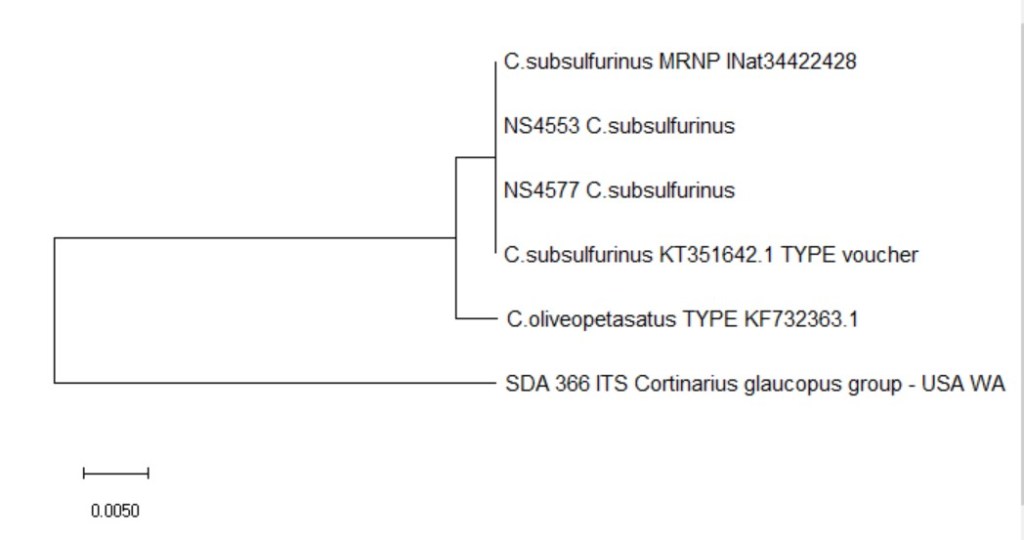 The species was not yet described at the time of the 2014 Phlegmacium Type paper (Liimatainen et al 2014) but the analysis of related species shows that C.subsulfurinus would be placed in section Calochroi & Fulvu
