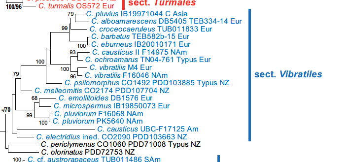 Cortinarius causticus is in /Vibratiles (Melot). There is no confirmed Type sequence of Cortinarius causticus on Genbank and there are many undescribed species. However, published papers have used reference sequences for the species concept (Garnica et al., 2016) and Soop (2019). A rough phylogenetic tree of local sequences in /Vibratiles shows that this is the most common species, matching GQ159868 which was identified as Cortinarius causticus in Garnica et. al. (2016). It is the same species as represented by Cortinarius causticus NAm II (UBC F17125 = GQ159868) on Soop’s phylogeny and My records show that at least 6 species occur in the Pacific Northwest.
