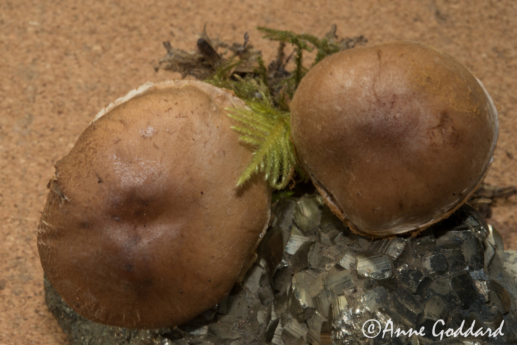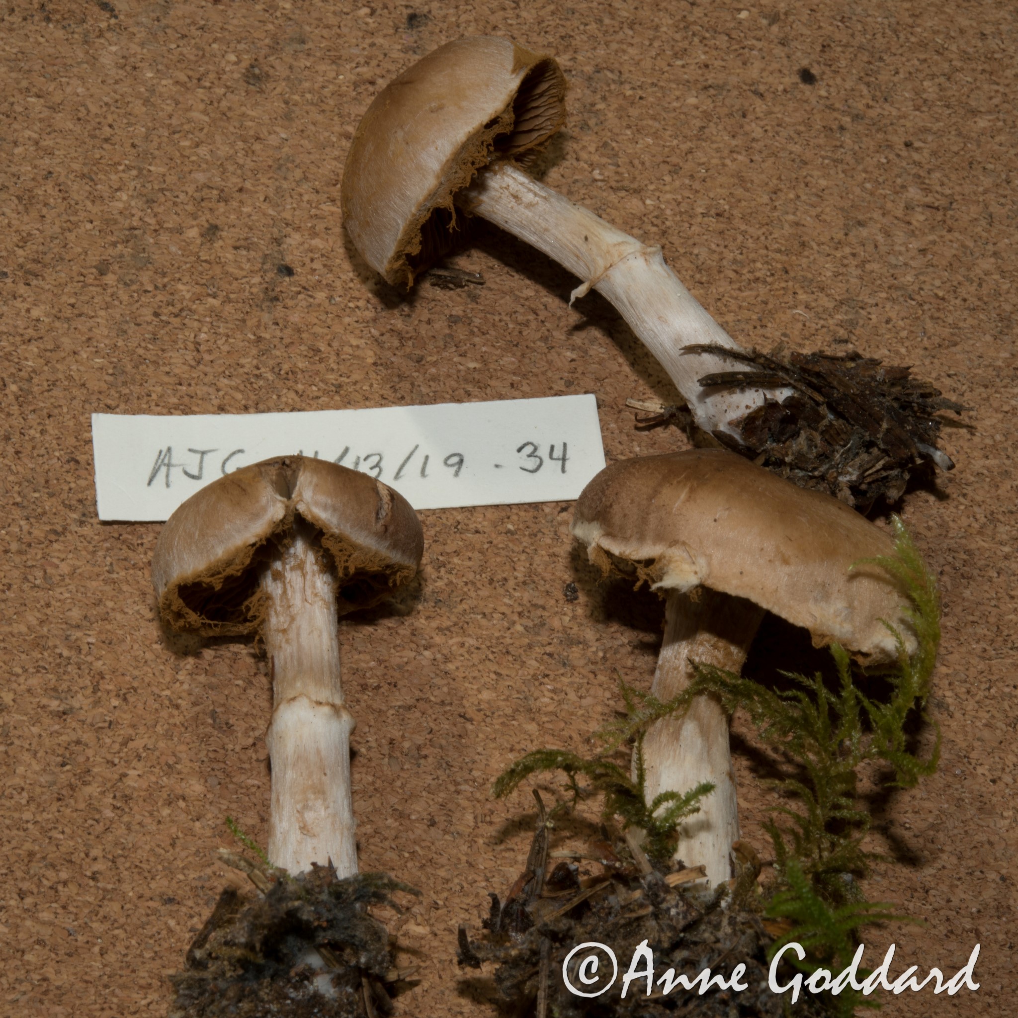 Pileus: 30-55 mm across, convex to plano-convex, disc occasionally umbonate when young, plane or depressed in age, hygrophanous, grey-brown to dark-brown, darker on disc, tan to yellow-brown when drying (sometimes in concentric bands), finely fibrillose and silky, with pale cortina remnants near margins, large black spots and markings in age or when bruised. Gills: Strongly emarginate (notched) and seceding in age, grey-brown to chocolate brown. Stipe: 70-110 mm long, 6-11 mm at apex, clavate to slightly bulbous, dingy brown to light brown with distinct annular sheath of pale floccose veil tissue or chevrons of material on lower half, darkening when handled. Cortina: Pale grey-brown. Flesh: Brown and cream striations, often tunneled dark-brown by larvae. Habitat: Coastal PNW, mixed conifer forest, Picea, Tsuga heterophylla, Pseudotsuga menziesii (European collections noted a Picea association).