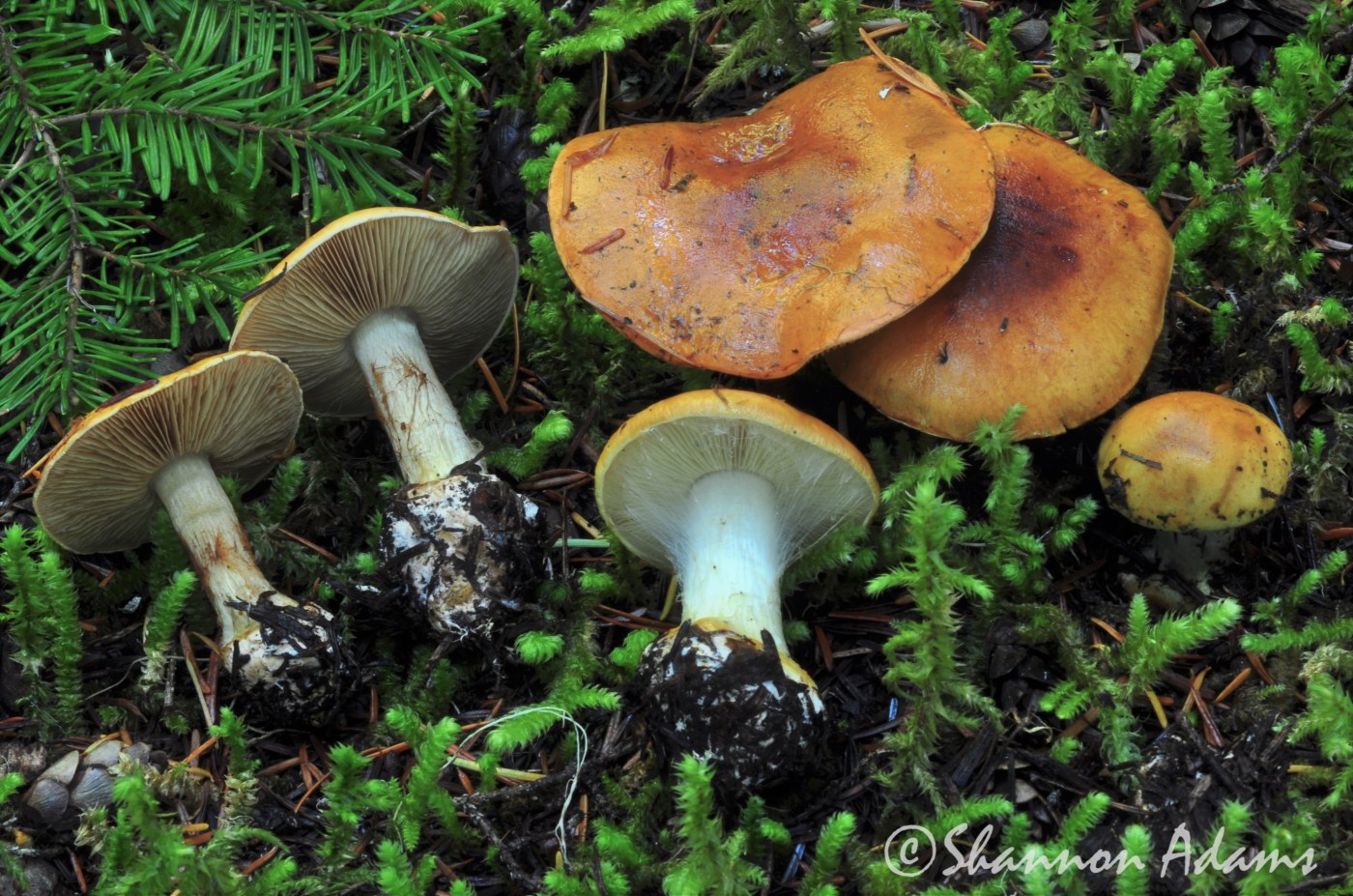 An olive-yellow Cortinarius with yellow gills, and obliquely marginate bulb, described from Austria. While there are several bright yellow Cortinarius species that occur in conifer forest, for our PNW region consider also Cortinarius metarius, Cortinarius cupreorufus and Cortinarius picea. Cortinarius metarius has brighter yellow tones (less olivaceous), and does not have the orange center of disc. The gills are lilac rather than yellow when young, and KOH is orange brown rather than burgandy. Cortinarius cupreorufus has lilac tones on young gills and bruises red on the bulb / bulb margin. It is also easily identified when dried by the uniform wine-red tone of the exsicata.