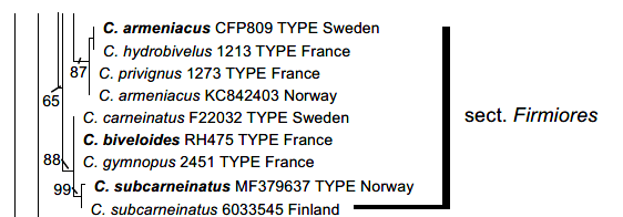 This collection matches the ITS region of DQ117925.1 which was published as an epitype in Kytövuori et al. 2005. Liimatainen et al. 2020 Figure 1 (below) places Cortinarius armeniacus in Telamonia section Firmiores and gives Cortinarius privignus as a synonym.