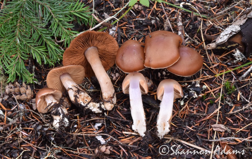 Cortinarius armeniacus is not often collected in our region, but is likely overlooked due to inconspicuous colors and general neglect of Cortinarius species. It can be recognized by the smooth to shiny, hygrophanous yellow to chestnut-brown cap with white margin, firm whitish-drab stipe and convex cap with low umbo. Reviewing images of collections identified as Cortinarius armeniacus (e.g. on Mycoportal and iNaturalist) it seems that the species is commonly confused with species in section Lanigeri. These species do not have a smooth and shiny cap surface and have distinctively bright orange gills. Another mistake is made with species in section Vibratiles which may also have a whitish stipe and whitish cap margin. These species can be eliminated by tasting for a bitter cap cuticle.