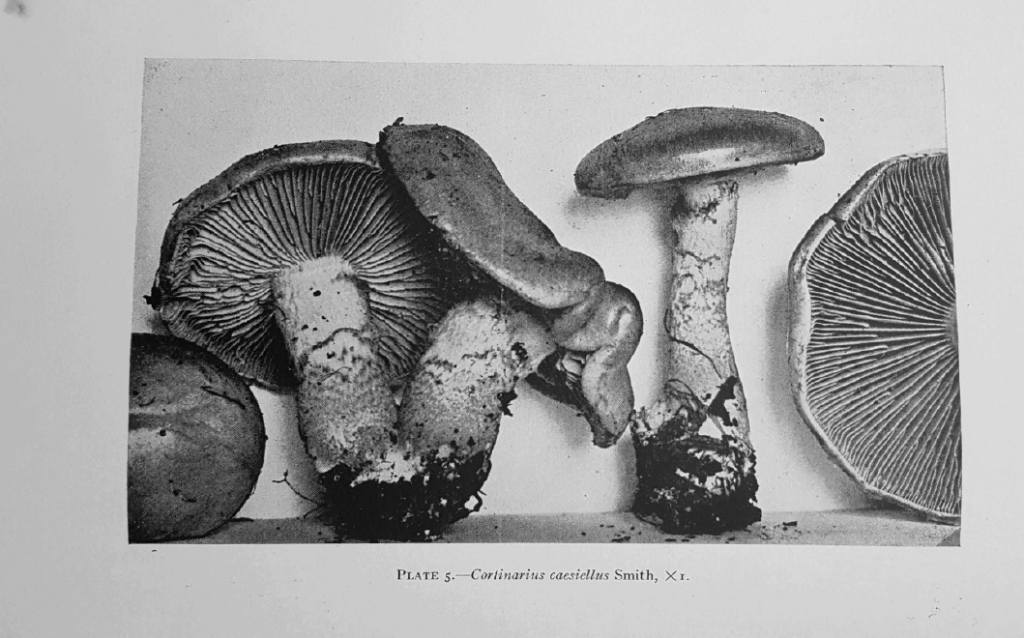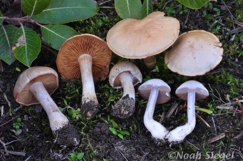 Named as the “white footed” Cortinarius, the species is distinct for being relatively large and substantial and having a distinctively pale ‘white’ stipe. There is some debate about the whiteness of this stipe – in that Alexander Smith separated out a local species he named Cortianarius caesiellus because although it was similar to C.albidipes it had orange-buff veil bands on the stipe, differentiating it as a new species. Genetic studies have now led to the two being synonymized. As you can see, Noah’s collection from OR has a relatively pale stipe without the strong veil zone’s in Smith’s photograph. Be on the lookout for both! It is widespread and occurs with a range of broadleafed trees, including in mixed conifer-broadleafed forests.
