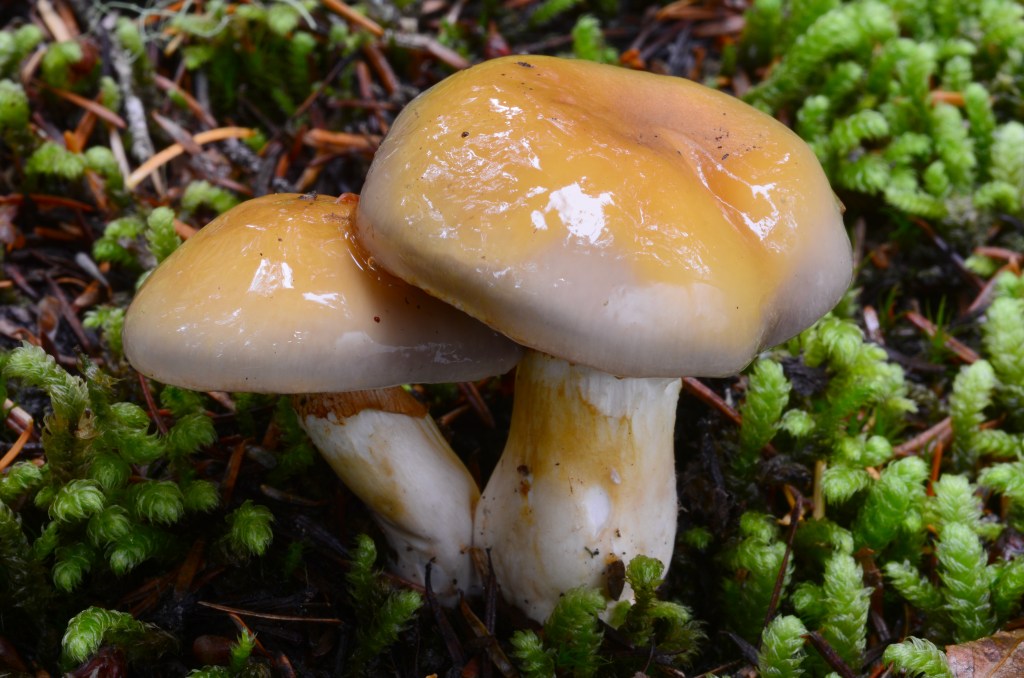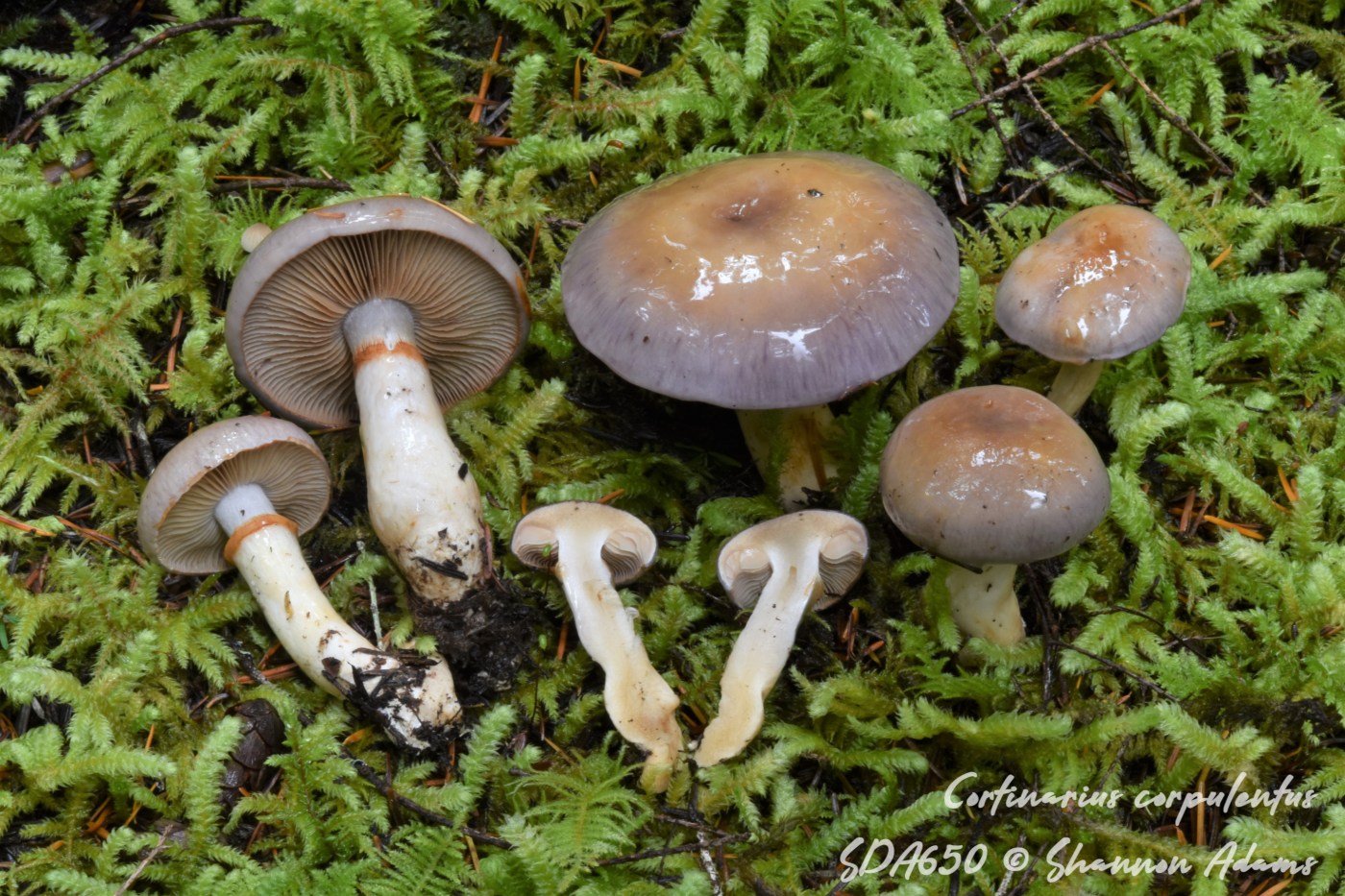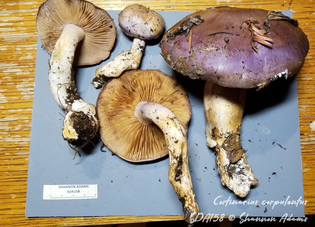 Cortinarius corpulentus is in section Delibuti. This section has several species in our region that have yet to be fully clarified. A commonly observed related species is Cortinarius salor s.l., which is significantly smaller and has a more slendor stature overall. By contrast, while the fruitbodies of Cortinarius corpulentus range in size, most tend to be large and stout. A key feature of species in section Delibuti is the glutinous stipe and pileus. Its distinct coloration of cap makes it one of the easier species to identify in the field. You may want to differentiate from Cortinarius oregonensis which has a similarly golden-brown disc and can have a lilac margin. However, it does not have a viscid stipe and tends to be more slender in stature, with pale cap.