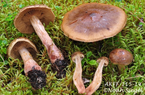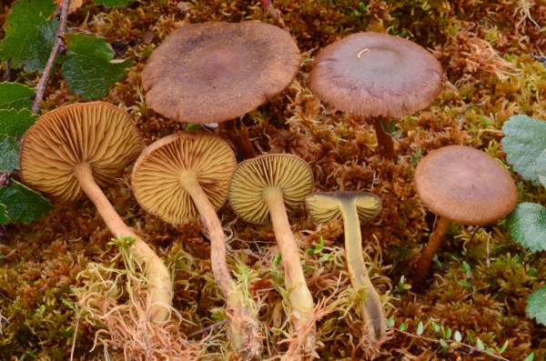 Cortinarius davemallochii, Ammirati, Niskanen & Liimat., Index Fungorum 196: 2 (2014) Location: Girdwood, Alaska.Habitat: Scattered in sphagnum bog, with Dwarf Birch. Collection Date: Aug 26th, 2014 Collector: Noah SiegelCollection ID: NS1876 Description:Pileus: 20-32 mm across, dingy dark orange brown to dark brown. Gills: Pale olive. Flesh: dark. Stipe: 40-52 mm long, 2-5 mm thick, with dark appressed cortina remnants and... Continue Reading →