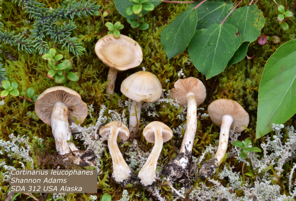 Cortinarius leucophanes P. Karst., Meddelanden af Societas pro Fauna et Flora Fennica 6: 3 (1881) Description Cap 12-40 mm across, viscid, cream to white with yellow-ocher disc, slight grey to tan concentric pattern, cortina white, gills pallid, stipe: 23-56 mm long, 4-8 mm thick at apex, flesh off-white, becoming orange-brown, odor and taste indistinct, KOH... Continue Reading →